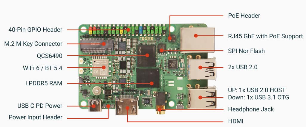 Radxa Dragon Q6A SBC — Qualcomm QCS6490 Octa-Core CPU, Adreno 643 GPU, 12 TOPS AI, Up to 16GB LPDDR5, WiFi 6
